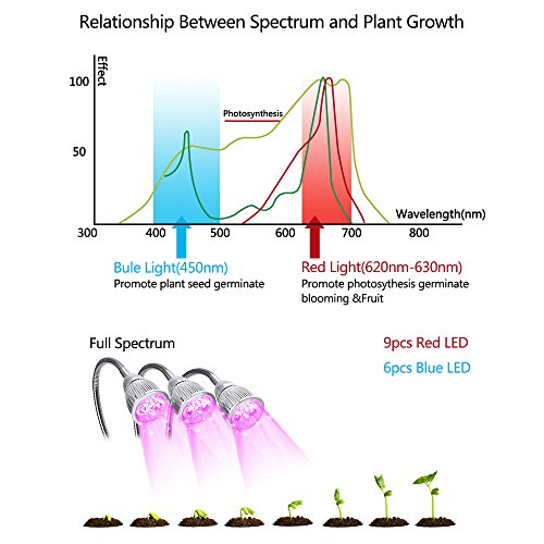 [15 LED] Red and blue LED combination, ultra bright, low power, high luminous efficiency and long service life. 6 Blue LED chips ensure plants take in more energy through the synthesis of chlorophyll to help in germination. 9 Red LED chips contribute to effective germination, flowering, and enhances photosynthesis for better results.