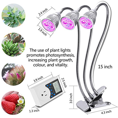 Grow light, Eleclist Led Three Head Plant Grow Lamp Timing Function 15W Grow Lamp with Outlet Timer and Adjustable 360 Degree for Indoor Plants Grow Lights Seed Starting Succulents Greenhouse (Silver)