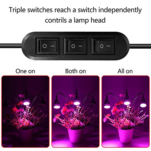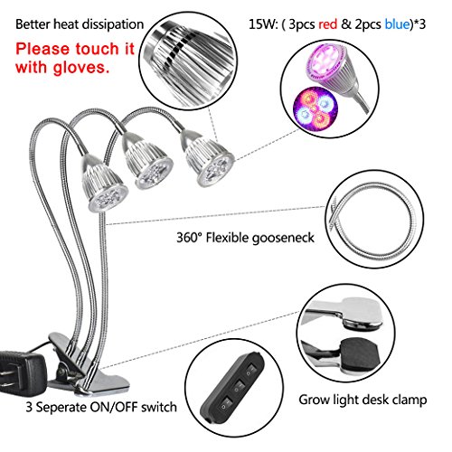 [Flexible Adjustable Light] With 360 degree flexible gooseneck and metal clamp, the gooseneck plant lamp is easy to adjust and position the light in any direction. The triple head light design covers a larger area and provide energy for more plants. Would be better to keep the distance between the light and plant about 20 inches.